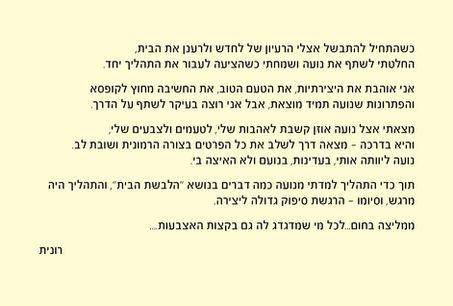 אני מאמינה שכל אדם צריך לאהוב את ביתו ולהרגיש בו בטחון ושקט, שמחה ואהבה. הבית הוא המקום בו אנו קמים כל בוקר אל קירות, חפצים, צבעים וריחות. הוא המקום אליו אנו חוזרים בסופו של יום לנוח, להרגע ולהרגיש בית.